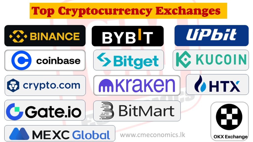 Cryptocurrency Exchanges (ක්රිප්ටො හුවමාරු ආයතන)By cmeconomics.lk / අදෘශ්ය මුදලක් වන ක්රිප්ටො මුදල් හුවමාරුව සිදු වන්නේ පරිගණක මෘදුකාංග හා ජංගම දුරකථන යෙදුම් (App) භාවිතයෙනි.ඩිජිටල් තාක්ෂණය භාවිතයෙන් ක්රිප්ටො මුදල් මිල දී ගත හැකි අතර ම ඒවා විකිණිම ද, එමගින් ගෙවීම් සිදු කිරීම ද කළ හැක.ලෝකයේ ජනප්රිය හා විශාල ම ක්රිප්ටො හුවමාරුව වන්නේ “බයිනෑන්ස්”(Binance) ය. මීට අමතර ව ලෝකයේ සිය ගණනක් පමණ ක්රිප්ටො හුවමාරු පවතී. පහත දැක්වෙන්නේ එවැනි ප්රධානත ම හුවමාරු කිහිපයකි.